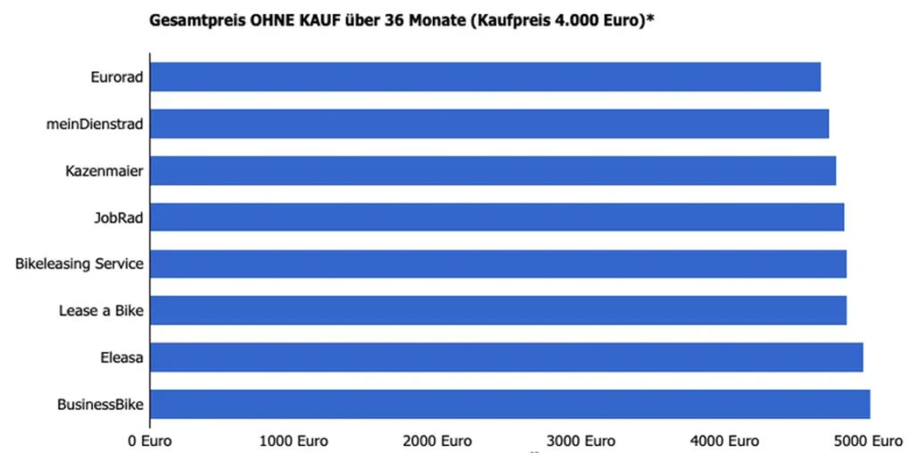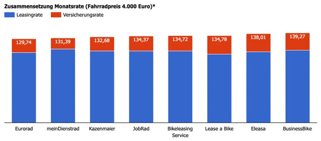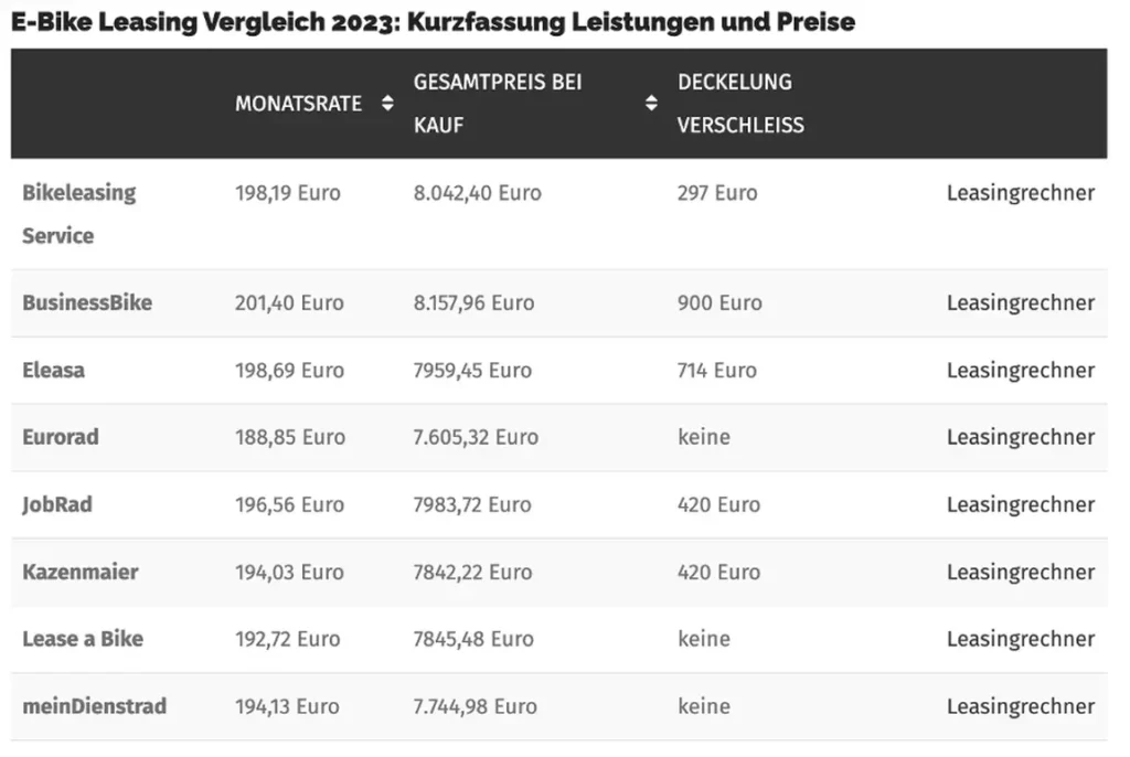 Im Vergleich des Fahrradmagazins Velomotion stehen die wichtigsten Leasinganbieter für E-Bikes: Bikeleasing Service, Business-Bike, eurorad, Eleasa, Jobrad, Kazenmaier, Lease a Bike und Mein Dienstrad. Verglichen werden die Leasing- und Serviceraten, sowie die Versicherungs- und Serviceleistungen für ein Bike zu 4000 und zu 6000 Euro Verkaufspreis. Die folgenden Tabellen zeigen die Kosten für ein 4000-Euro-E-Bike, für die vollständigen Testergebnisse auf Velomotion bitte den Link am Ende des Textes anklicken. Die aufgezeigten Kosten sind die Raten, die auf das Bruttogehalt angerechnet werden. Die tatsächliche Nettobelastung richtet sich nach weiteren, individuellen Faktoren wie Bundesland, Steuerklasse, Kinderfreibeträge und so weiter.